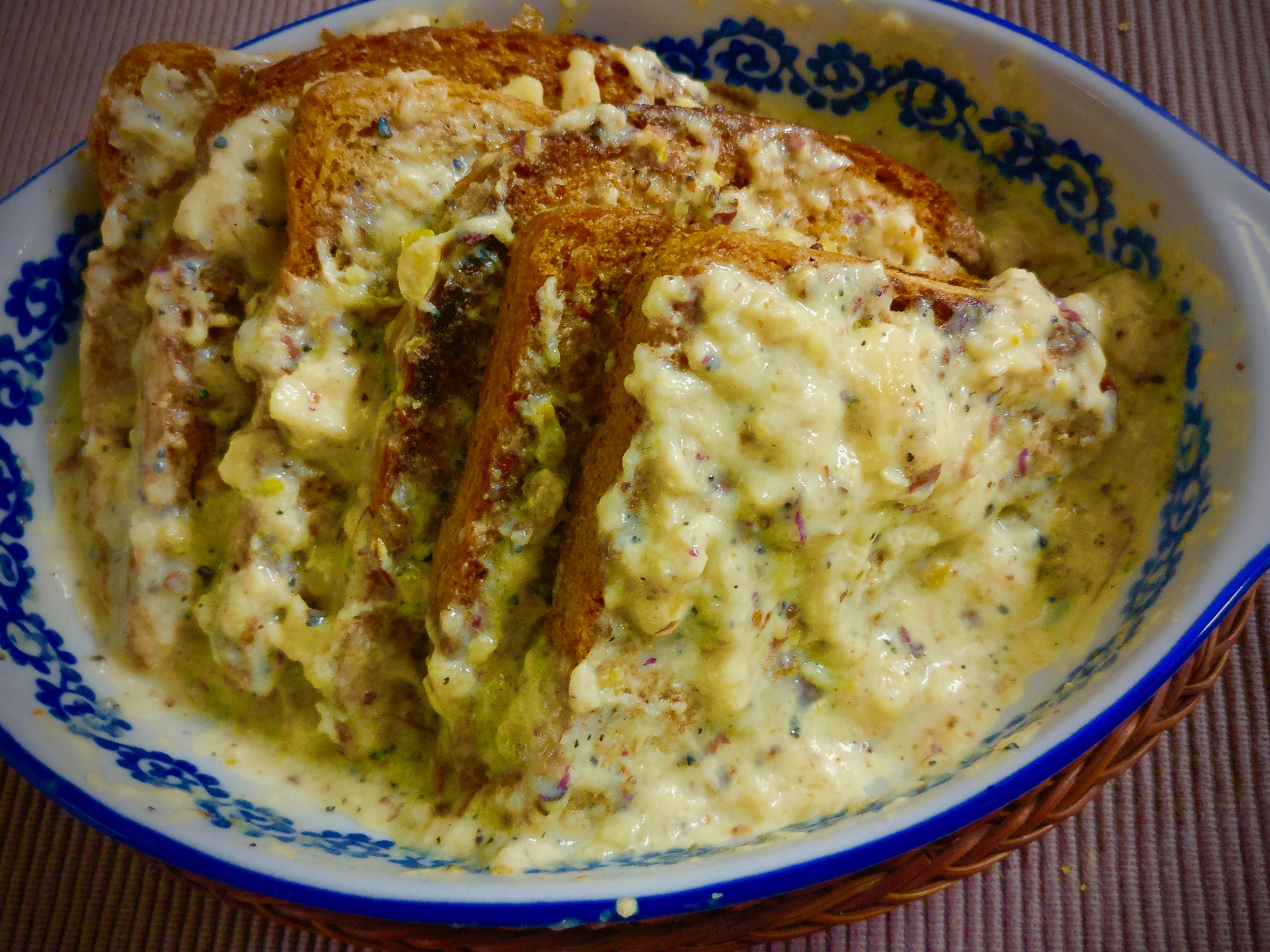 Traditional shahi toast uses white bread, and a thin milky sauce resembling a basundi. However, I wanted my version to have a thick rabri-like, fragrant, creamy, nutty base that would be topped on crunchy, multigrain bread toasted with ghee – but not soaked in it. I wanted it to retain its indulgent feeling without too much sugar or fat. One time-saving hack was to toast the bread in the oven (OTG) on a pan greased with ghee, rather than fry it on a pan. The oven also removes the moisture from the bread, leaving it crunchy as well as crispy. For such low effort, the result is pretty spectacular. Just be sure to assemble the dish at the time of serving or max. 30 mins before, else the bread will begin absorbing all the creamy liquid, leaving a sludge of nuts behind! If this happens, simply add in more milk to the dish. Arguably leftovers the next day are even better, when the bread soaks up all the milk and flavour, and becomes soft and spongy like rasmalai!