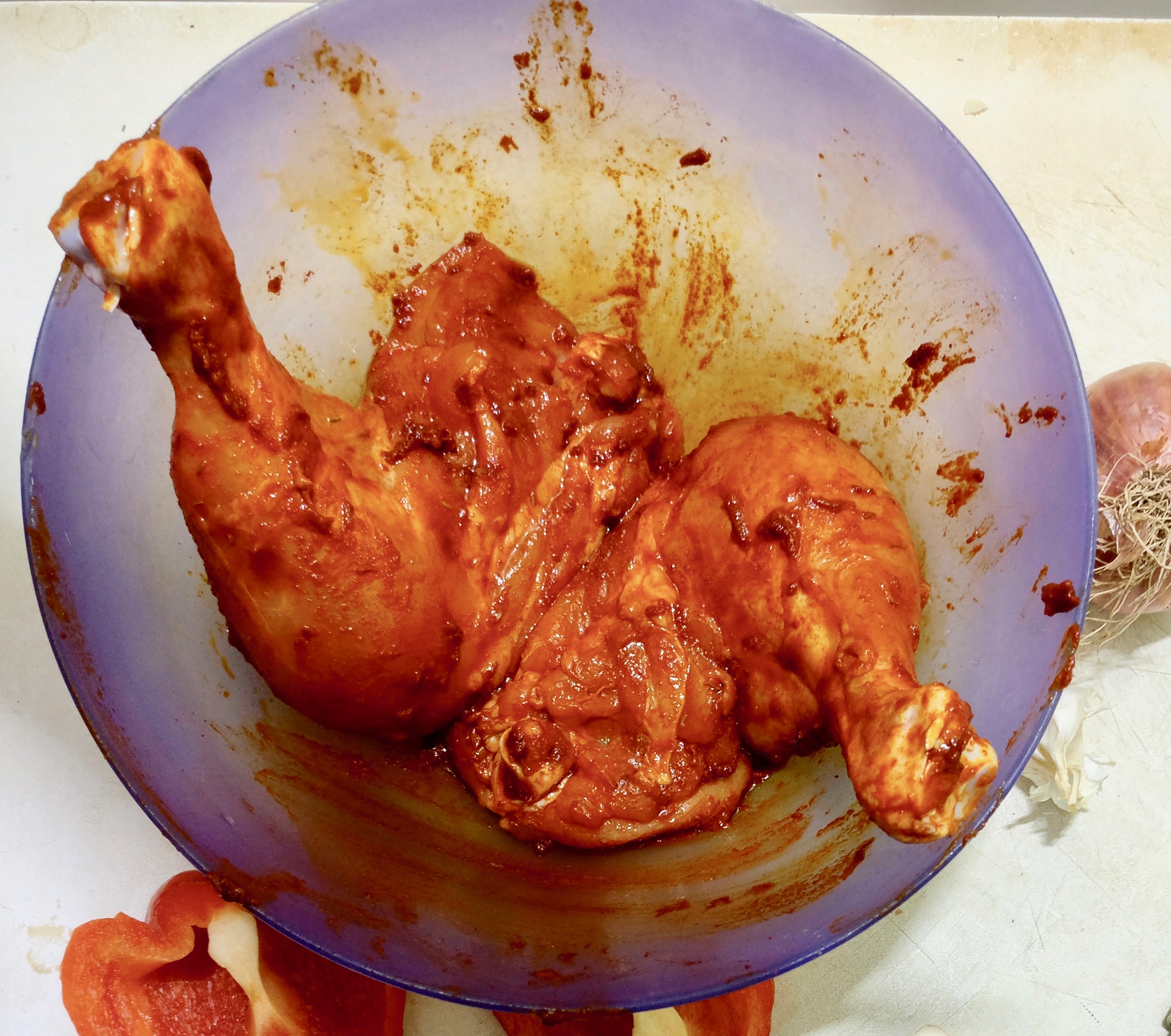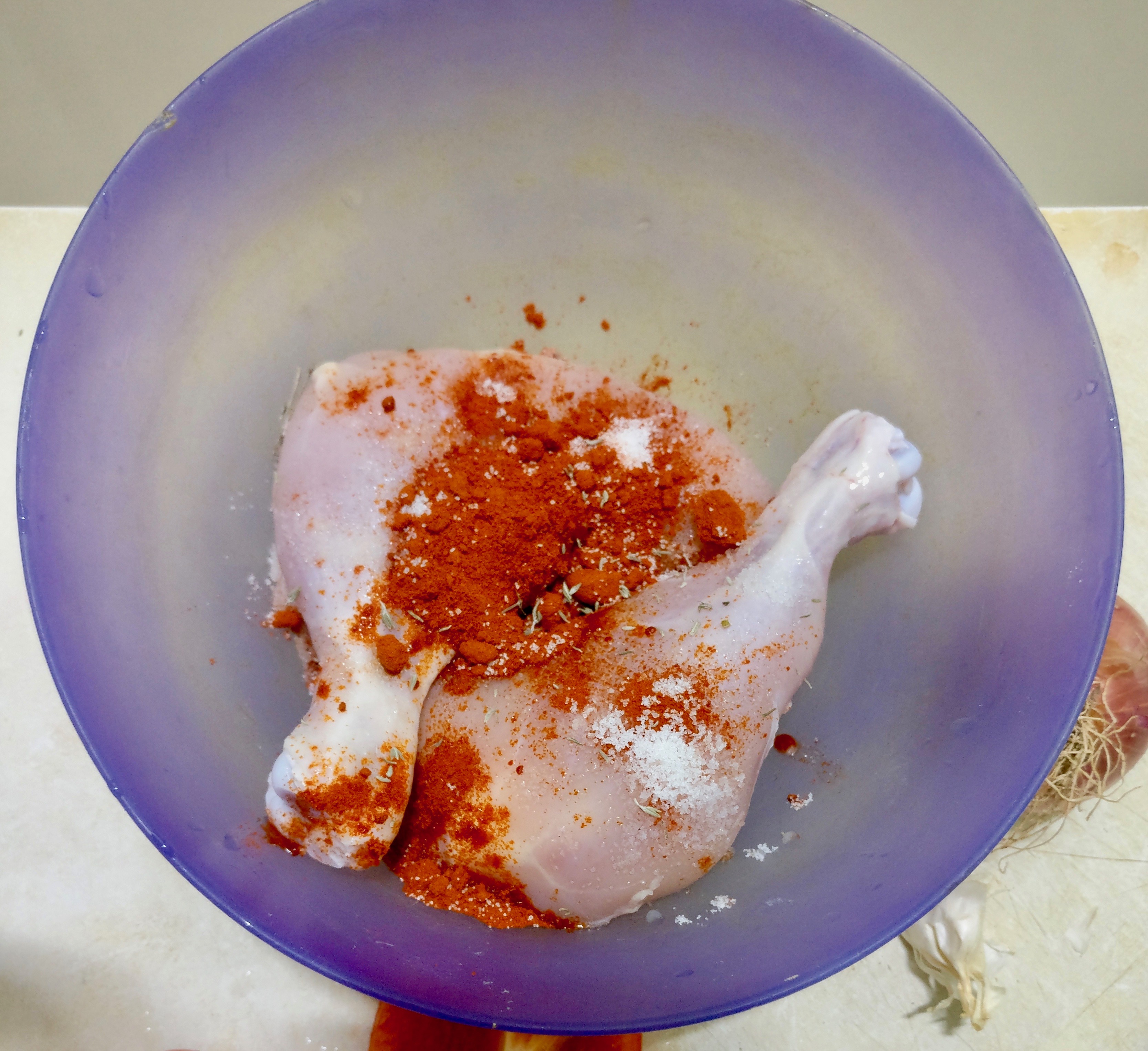 1. Rub the chicken with 1.5 tsp smoked paprika, thyme, 1 tsp salt and 1 tbsp olive oil and leave it to marinate for at least 15-20 mins. (could do overnight).