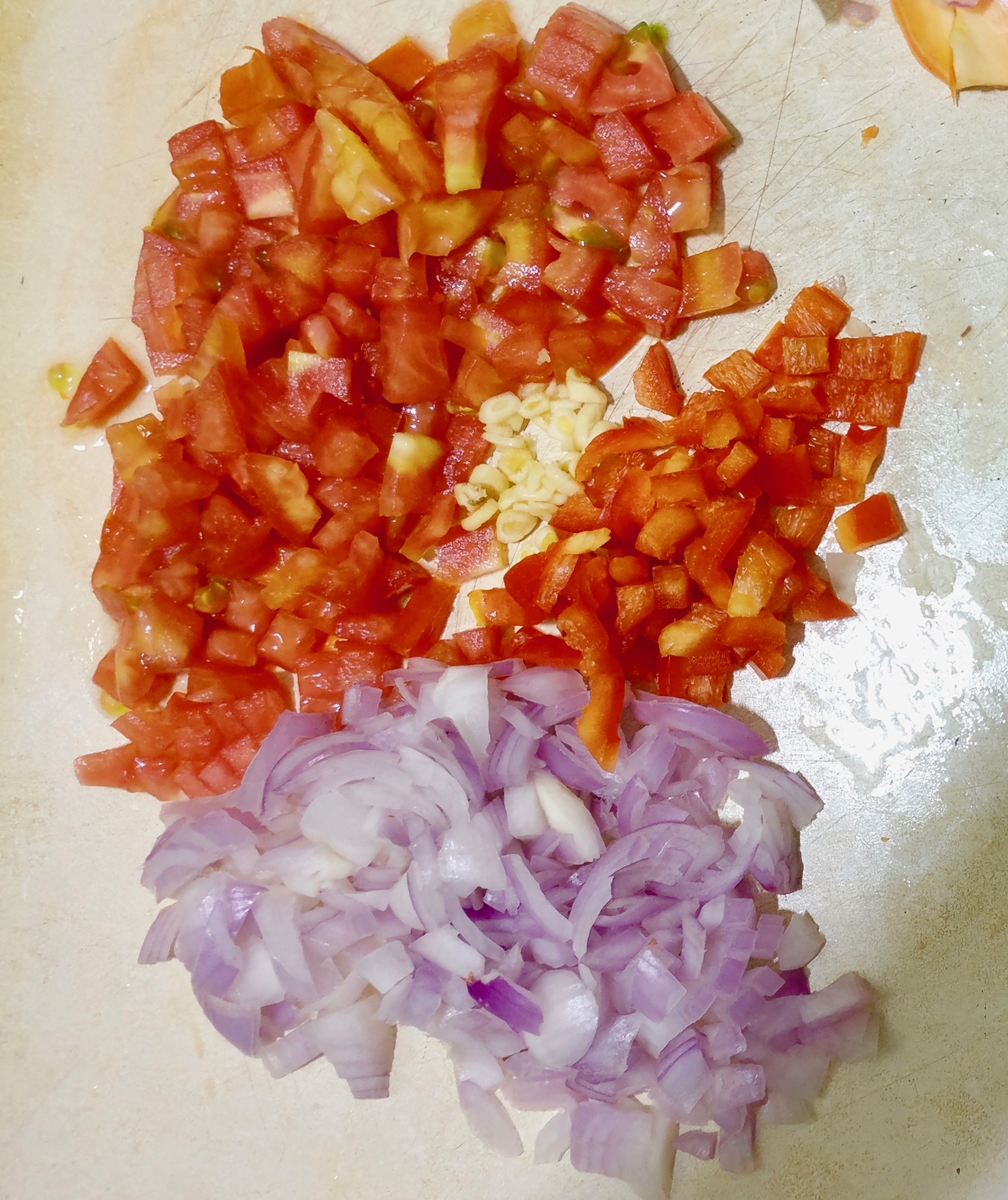 4. Dice or slice the vegetables for the sofrito: onion, tomato, red capsicum, garlic.
