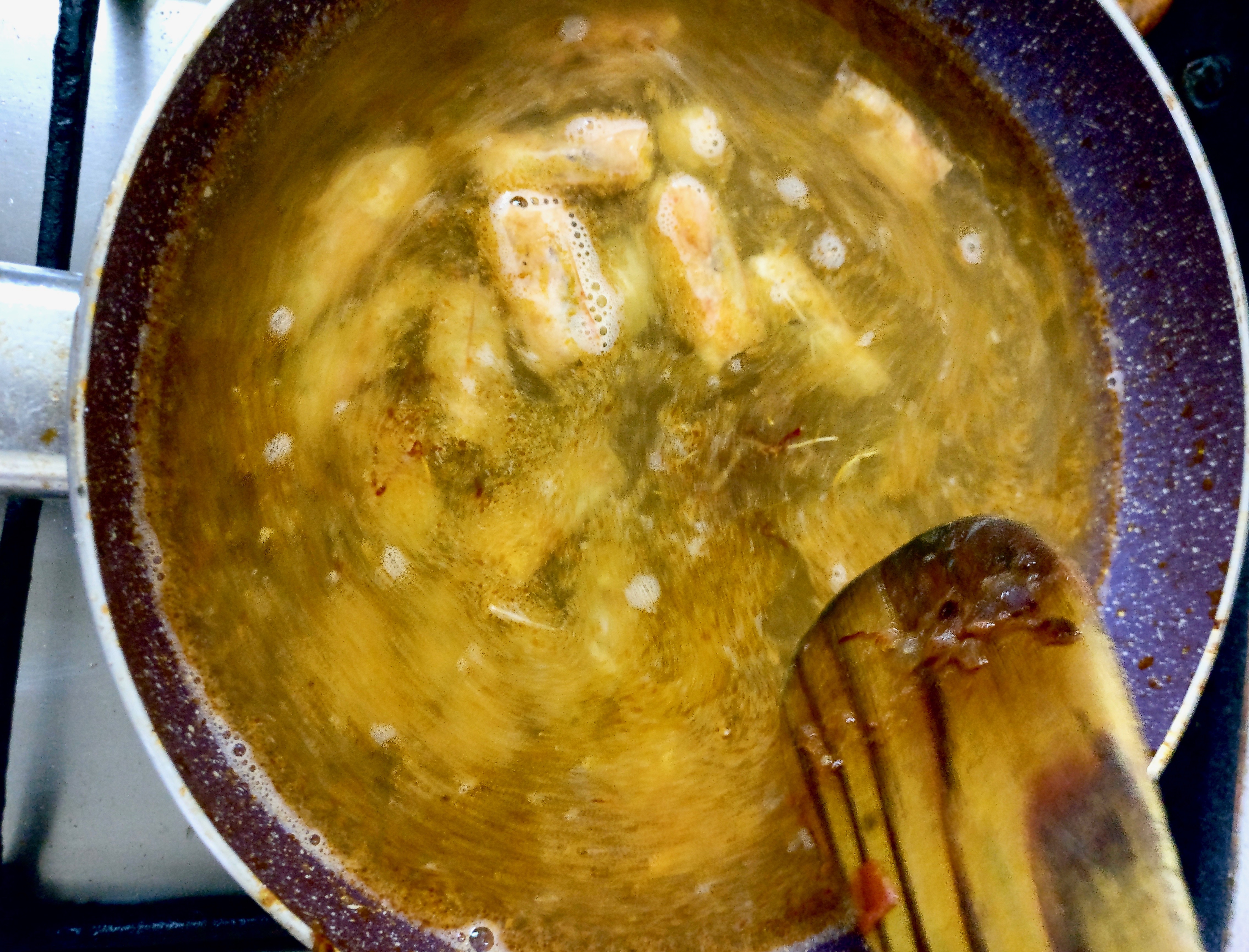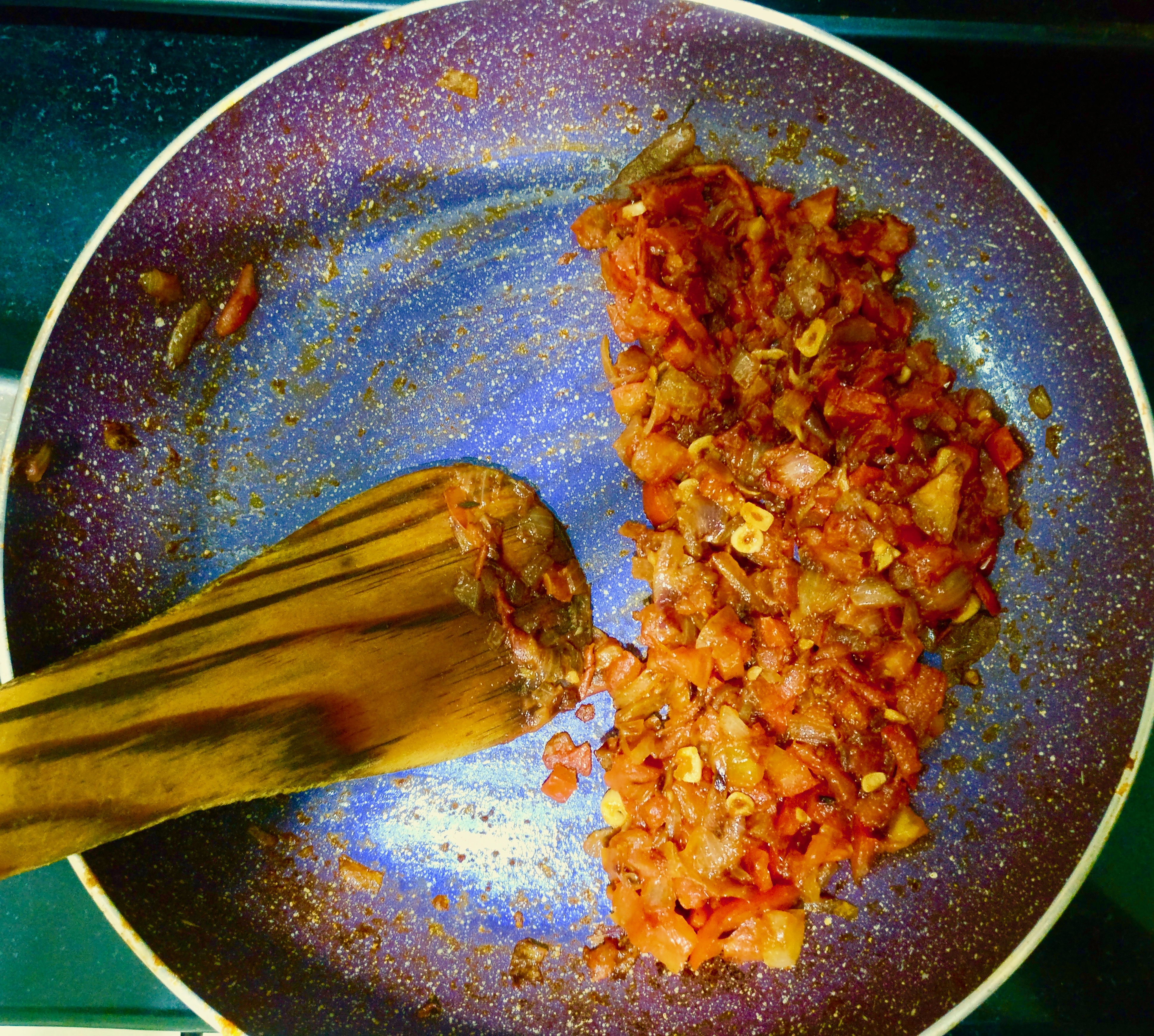 3. Fry the discarded shells along with the heads in 1 tbsp olive oil till it turns pink. Add the water, 1/2 tsp salt and let it boil for 10-20 minutes. (Till then till you make the sofrito, in steps 5 and 6).