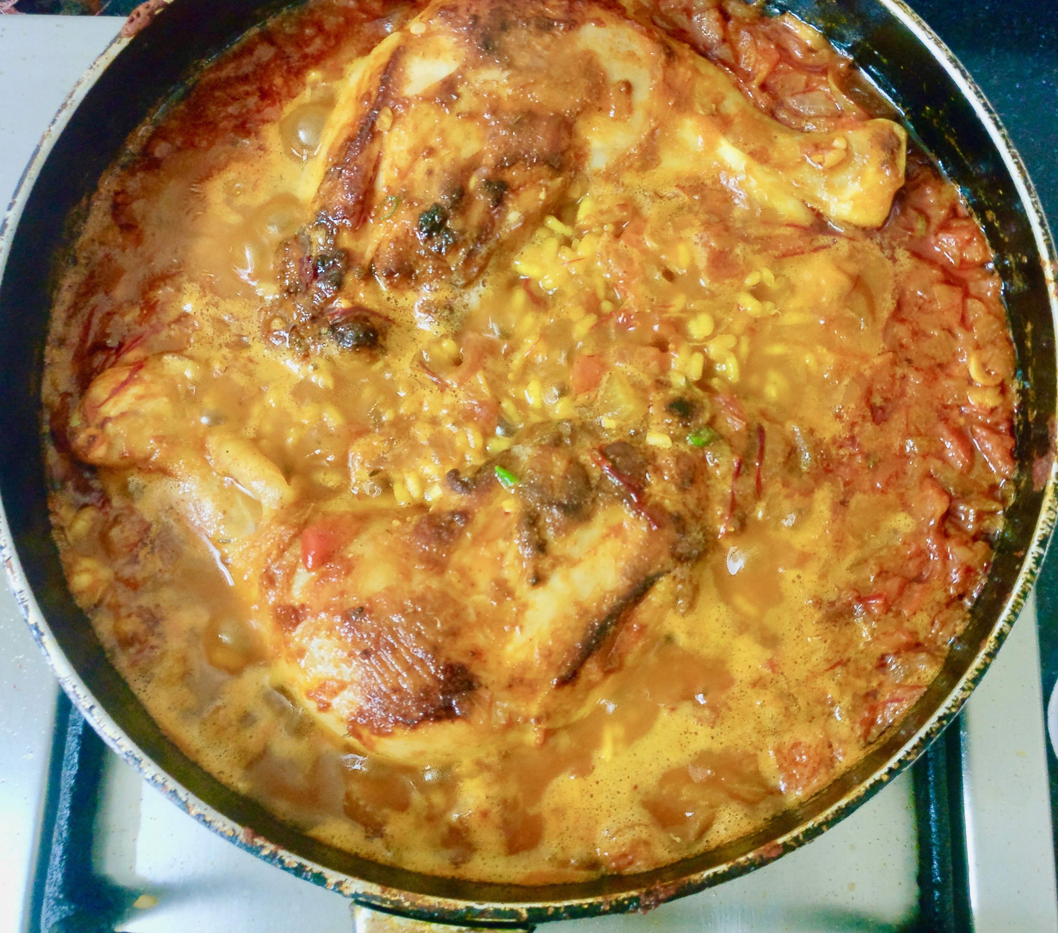 - Flavouring: Smoked paprika can be very strong, so a total of 2 tsp is enough. You can add it to the meat, a pinch to the sofrito or the stock. If you are using the sweet or regular variety, you can additionally use a little red chilly or cayenne pepper powder for the heat. I found that it gives a seasoning and colour to the chicken. You can add a tiny amount of dry herbs (rosemary, thyme, oregano) you have to the chicken; I added a pinch of thyme. Don’t use a lot of dry herbs in the paella itself as they have a strong smell and taste and will overpower the delicate, floral saffron. You can also use 100 ml of white wine or sherry wine and saute the rice and sofrito in it before you add the stock.